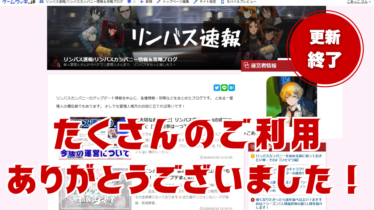 【更新終了のお知らせ】たくさんのご利用、誠にありがとうございました!【最後のご挨拶】リンバス速報/リンバスカンパニー情報&攻略ブログ -